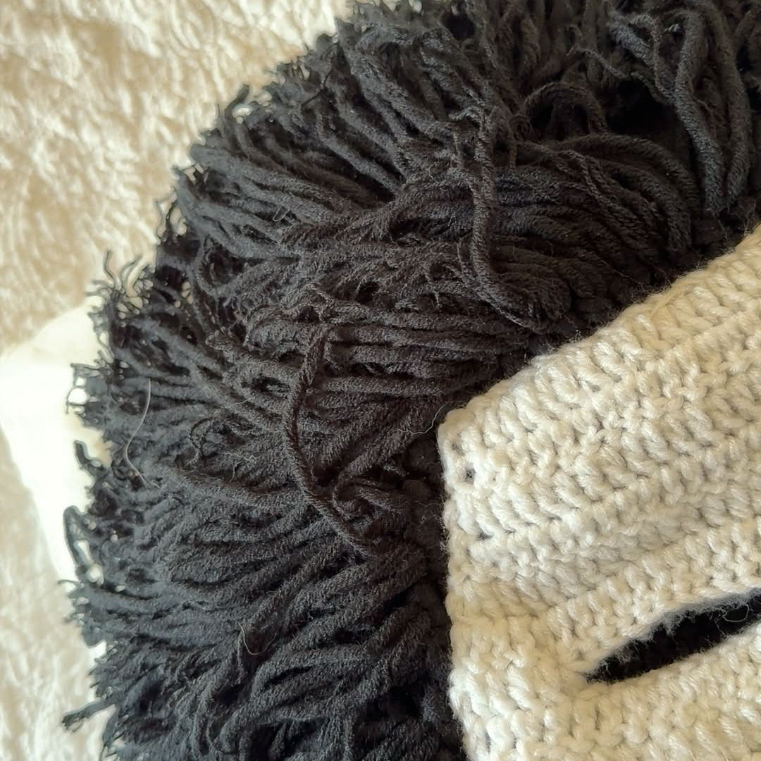 • over 1000+ strands of 9inch yarn pieces threaded and knotted in to the mask